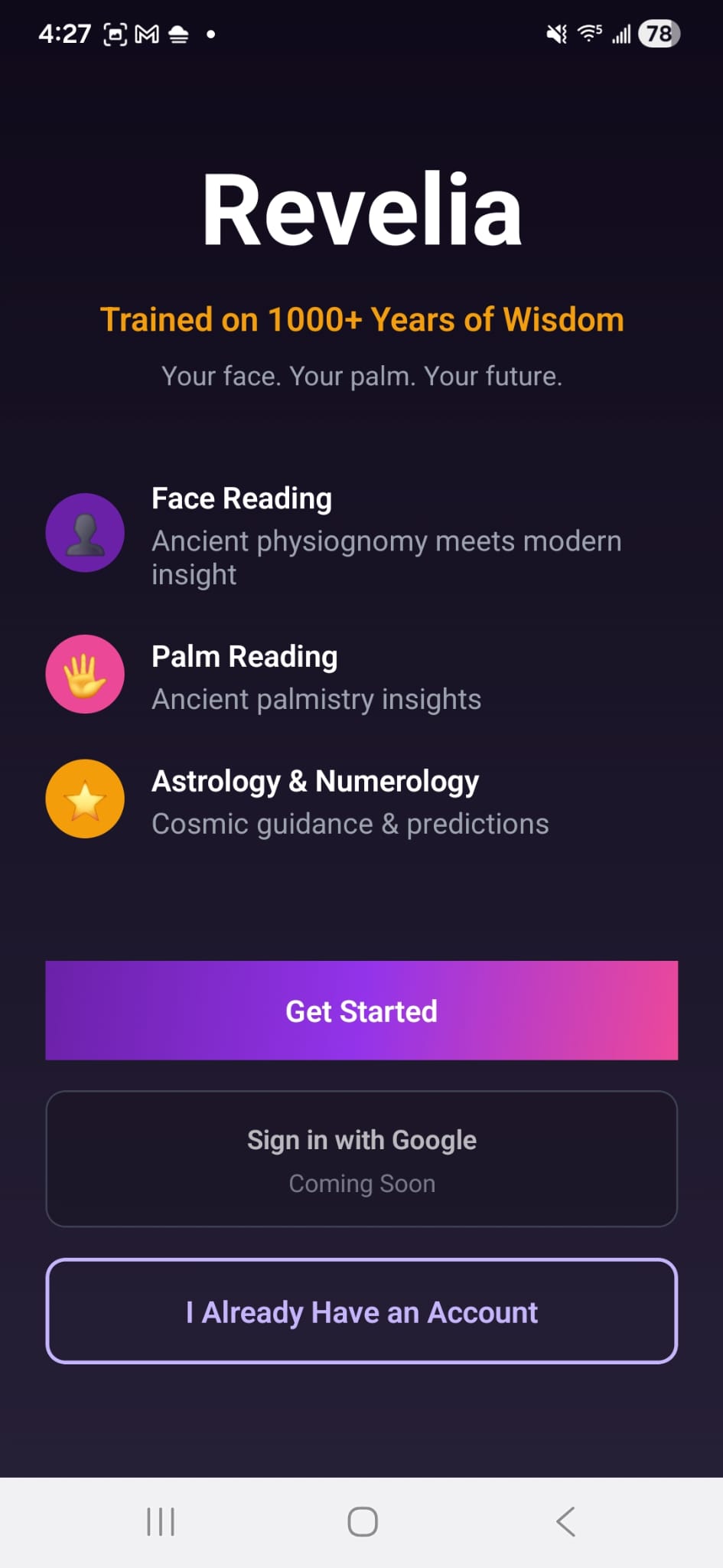 Revelia is an AI-powered app that combines face reading, palm reading, astrology, numerology, and compatibility analysis to provide personalized insights and self-discovery tools.