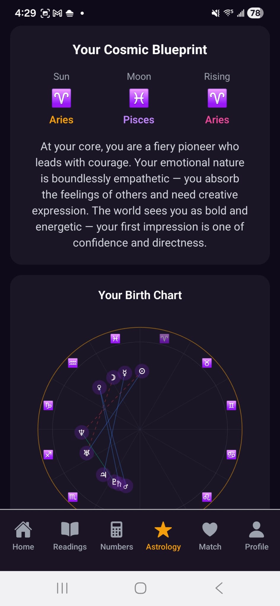 Your complete cosmic blueprint — Sun, Moon, Rising, and planetary positions. Daily insights, weekly forecasts, and monthly readings personalized to your chart.