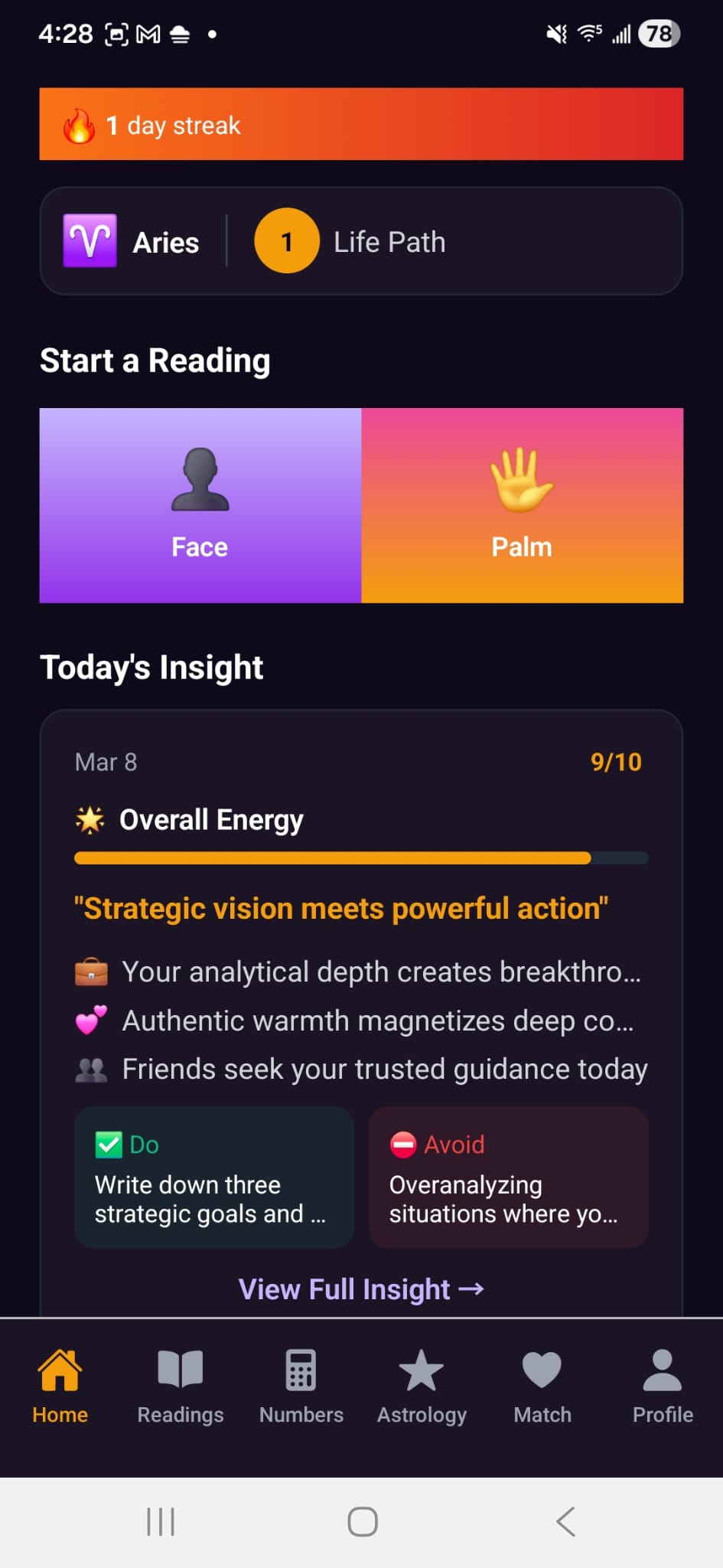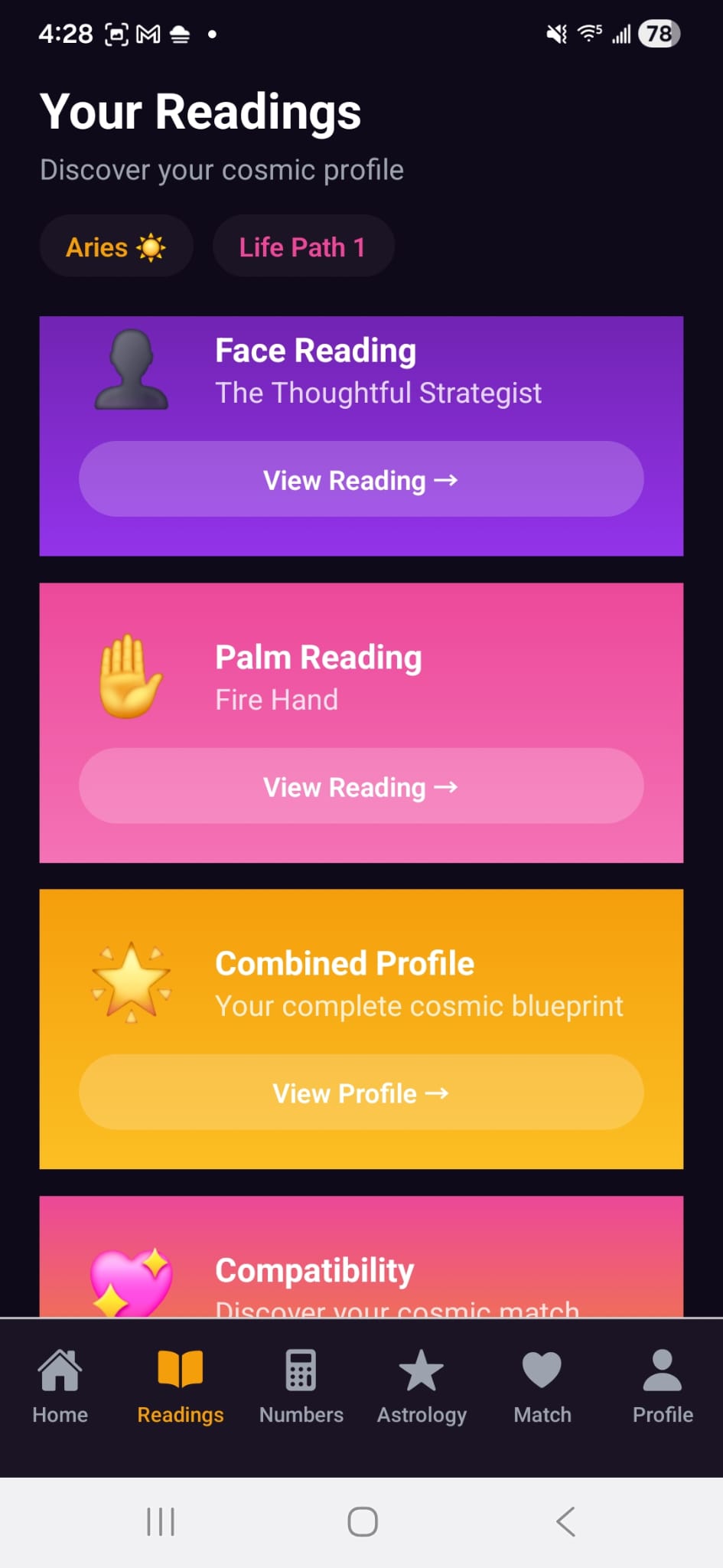 Your face and palm photos are stored securely and used only to generate your readings. They are never shared with other users or sold to third parties. You can delete your photos at any time through the app.